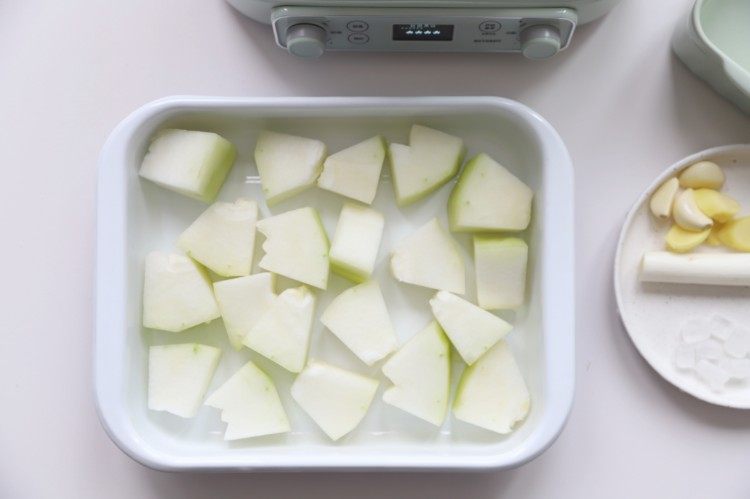 电磁炉屏幕显示的剩余时间还有20分钟时,往锅内倒入冬瓜。
