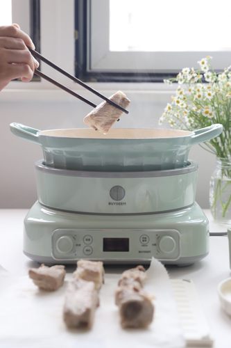 选择“自由烹饪”菜单,调至4档火力,往北鼎25cm焖炖珐琅锅里倒入食用油,放入排骨煎出香味,然后加入八角、桂皮、香叶、姜片、蒜瓣和冰糖。