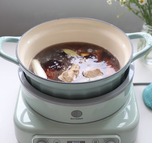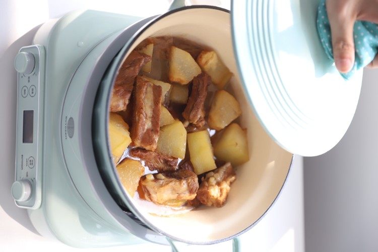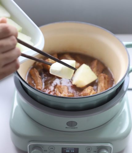 锅内加入800ml热水,再加入生抽、老抽和蚝油,盖上锅盖。北鼎电磁炉选择“炖牛腩”菜单,调到香韧口感,按开始键开始烹饪。