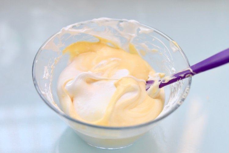 取1/3打发蛋白霜与蛋黄糊混合均匀