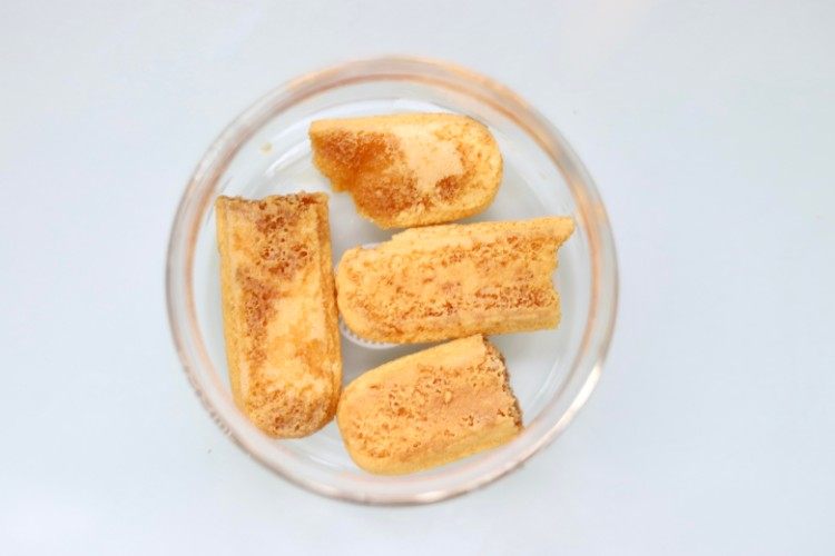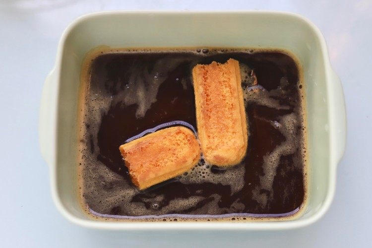 往猪猪盒倒入浓缩咖啡,加入朗姆酒混合均匀,手指饼干掰成能放入罐子的长度,放入混合后的咖啡酒液中滚一圈,让饼干表面蘸上咖啡酒液体