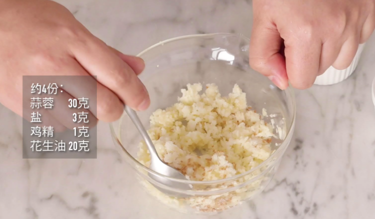 自制蘸料1:蒜茸30g,盐3g,鸡粉3g,花生油20g
