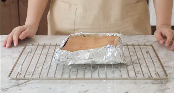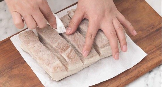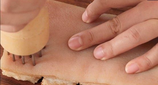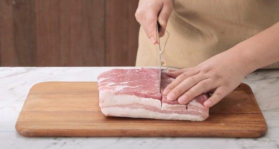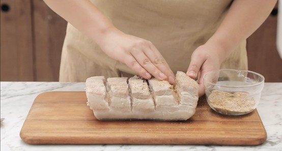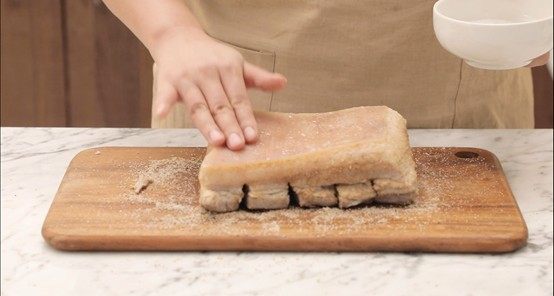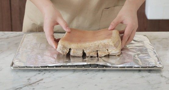 1、五花肉在烘烤前注意修整为“凸型”,即中间高四周低。这样方便烤出的油脂留向四周,确保整体脆皮鼓泡均匀细密。