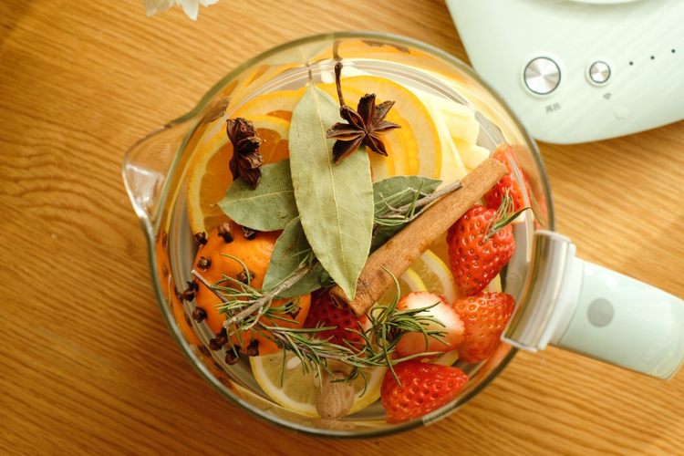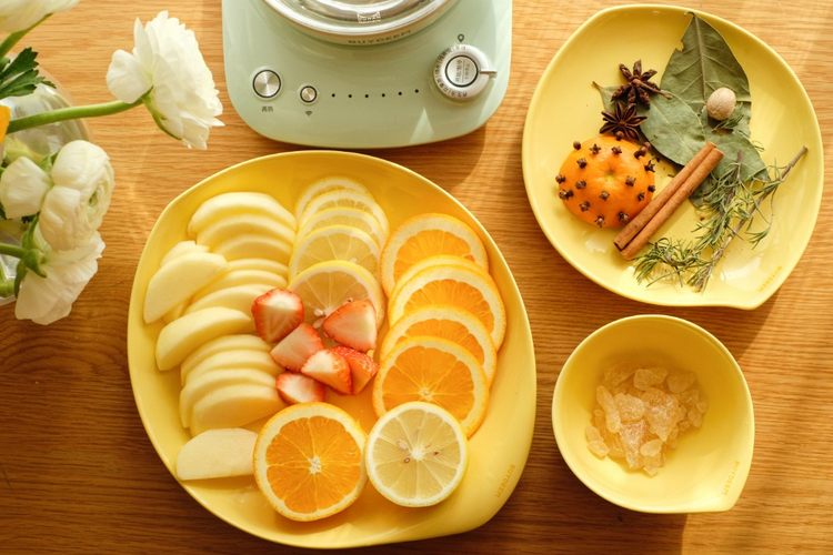 苹果去皮切厚块,草莓对半切开;柠檬橙子用盐搓洗表面,其中一半切薄片;柠檬的另一半留着一会挤出汁水,橙子的另一半插丁香