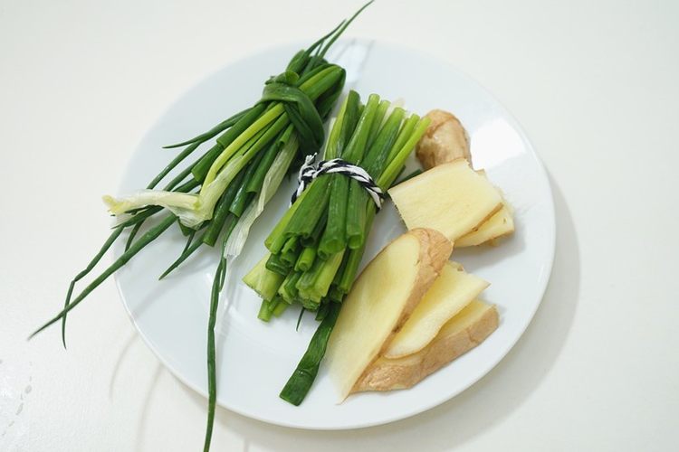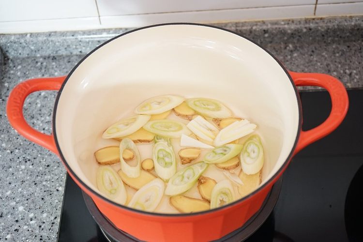 然后铺满生姜片和大葱段,这样不仅防止粘锅还有很好的增香提味的效果