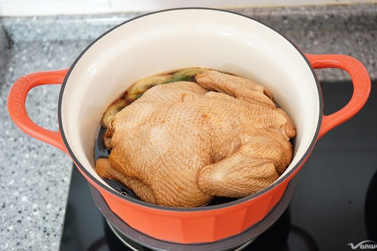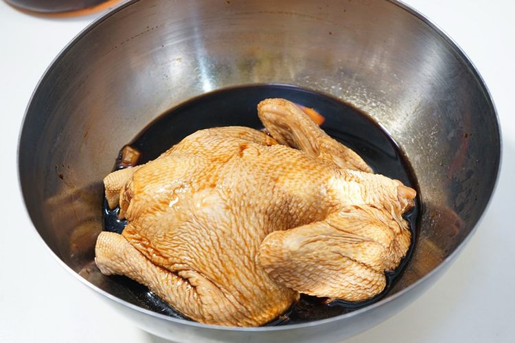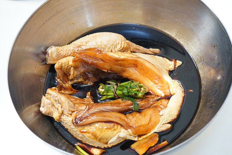 腌制好的鸡拿出来放进锅里,加入1小碗刚才腌制鸡的料汁,沿着鸡身倒进去,放心足够了