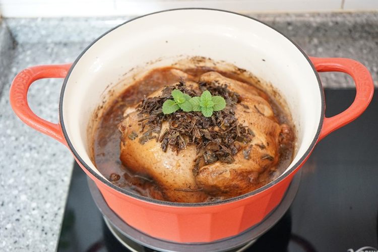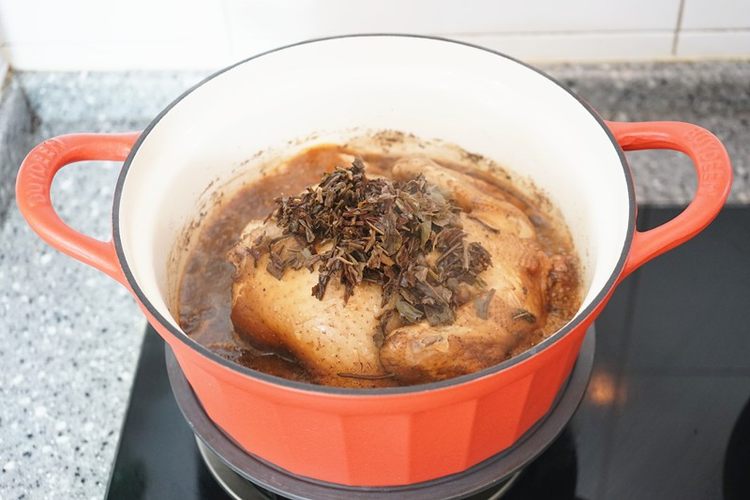 .时间到看看这色泽多诱人啊,完全不用担心你们看锅里的汤汁还有呢,刚才泡茶的茶叶放到鸡的上面