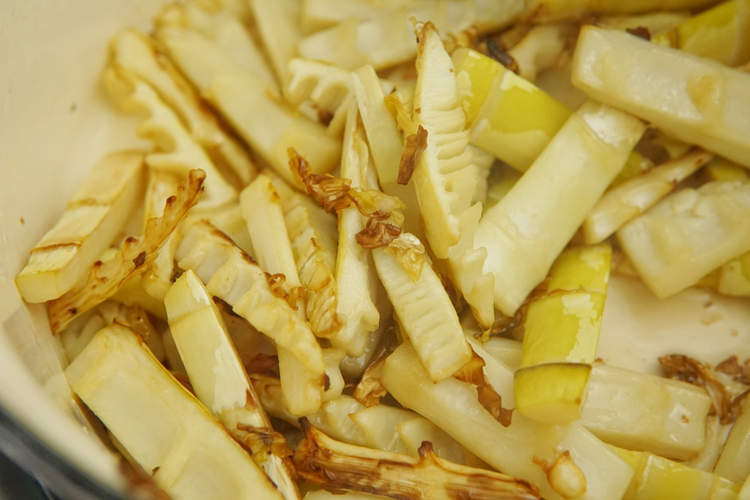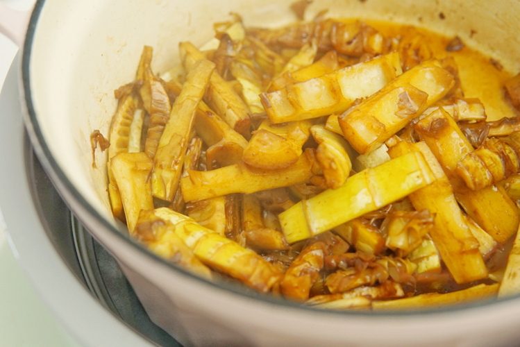 2、初入锅的鲜笋也需要用油反复翻炒,直到笋的边有微微的姜黄,色泽油润,香味出来了再调味。