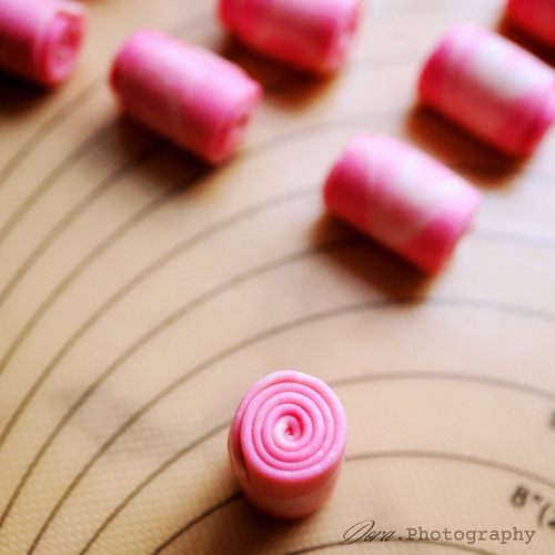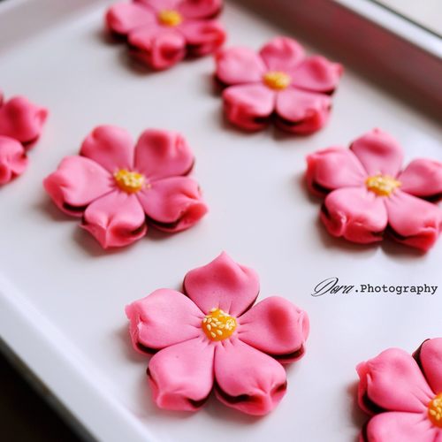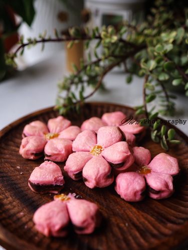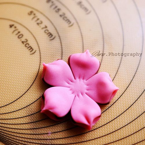 豆沙平均分成16份,取松弛好的面团中间按薄两头往中间推捏,按扁擀圆,包入豆沙馅,收口朝下滚圆。再用手掌按扁,切出五条边,取一个花瓣两头往中间捏紧,做出花瓣再用小刀刻出花蕊
