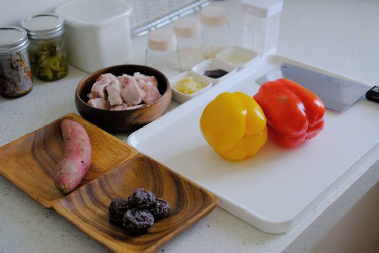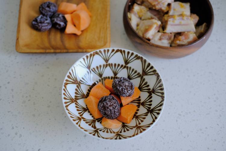 地瓜和梅子铺底。