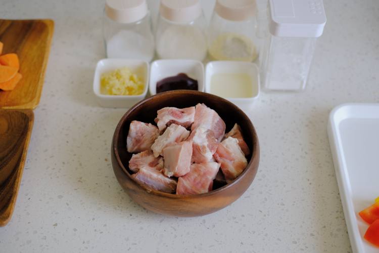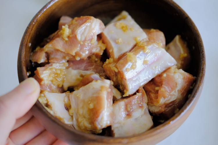 用压蒜器把蒜(4-5瓣,根据排骨多少调节调料用量)压成蒜泥或切碎,把蒜泥、糖、盐、鸡粉、淀粉、蚝油、玉米油一起加入挤干水份的排骨,抓匀后腌制半小时到一小时左右。