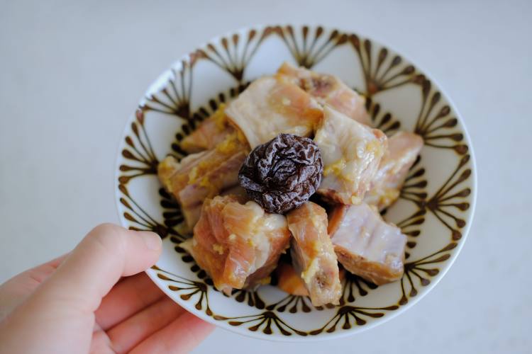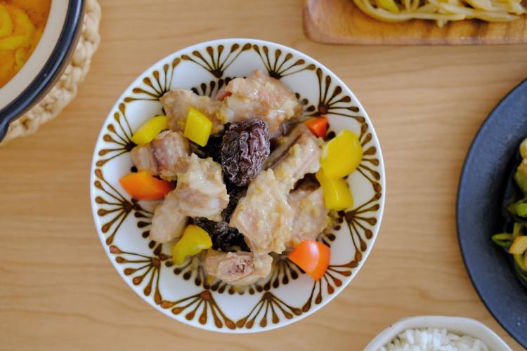 再把腌制好的排骨放上。