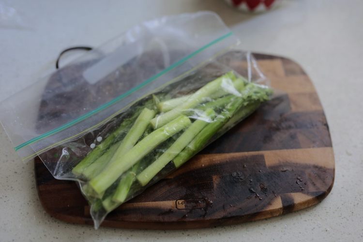 将切好的芦笋装入密封袋中,再加入5克橄榄油,隔着袋子抓匀,然后将袋子里的空气尽量排空,封口