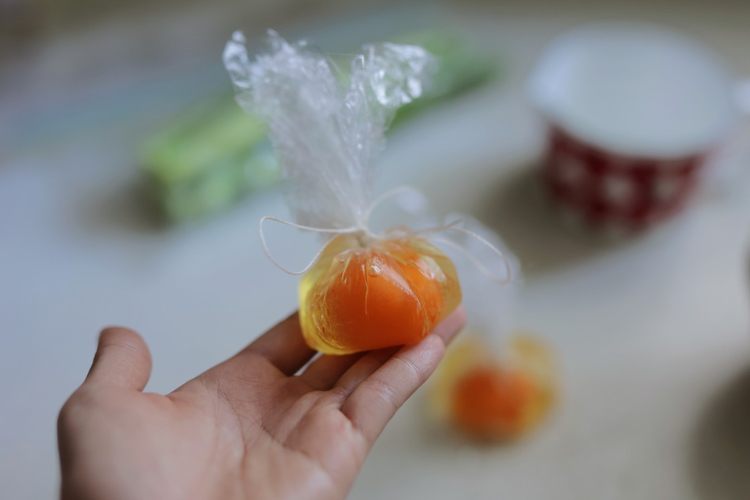 取两个小碗,铺上一层耐高温保险膜,再刷一层薄薄的橄榄油,将蛋磕入碗中,抓起保鲜膜把蛋包起后用绳子扎紧,这样做就不用担心水波蛋打到水里不成型啦