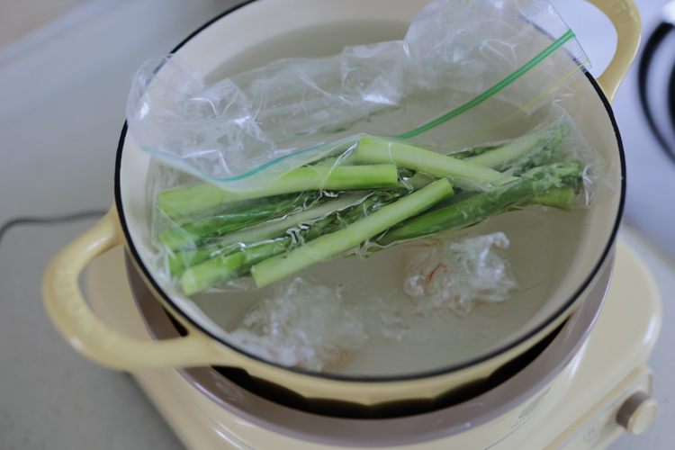 从保鲜袋内取出芦笋,将保鲜膜剪开取出鸡蛋,再撒些黑胡椒和海盐调味已经足够美味,低温煮的芦笋特别鲜嫩多汁