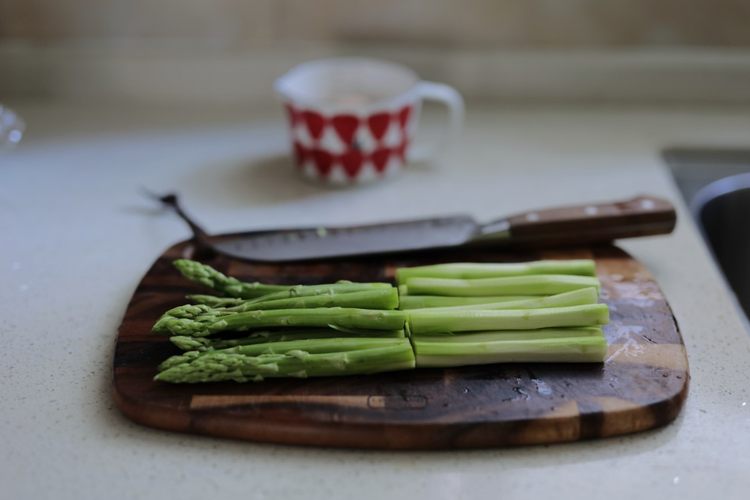 将芦笋洗净,切掉后面比较老的部分,再将后半部分削皮,这样口感会更嫩更脆,然后将芦笋对半切成两段
