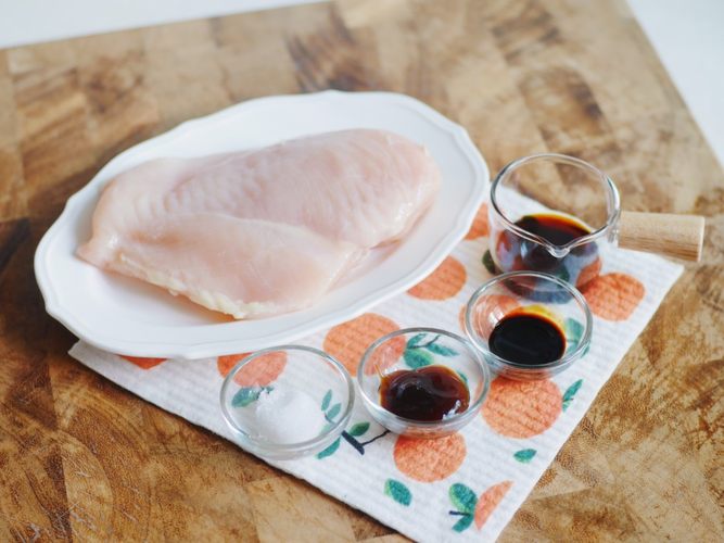 把鸡胸肉放进密封袋中,倒入生抽,蚝油,老抽,砂糖,轻轻揉一下袋子,让调料均匀包裹在鸡胸肉上