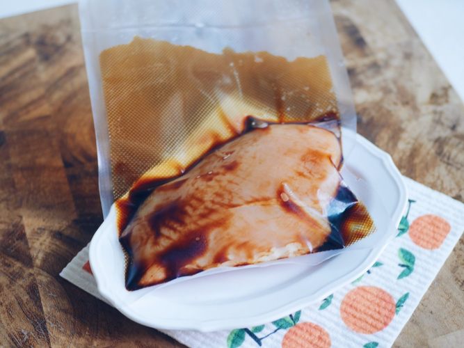 用真空机把鸡胸肉和调味料密封在一起,腌制30分钟(没有真空机的可以用密封袋配合一大盆水来密封)