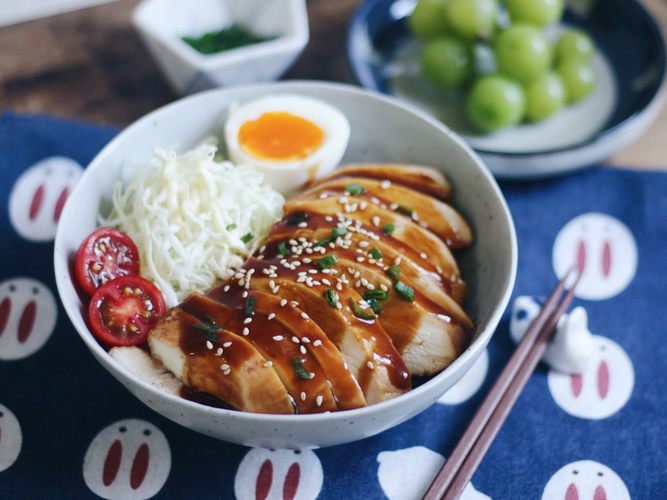 把鸡胸肉切片铺到饭上,淋上酱汁,放上配菜就完成啦~