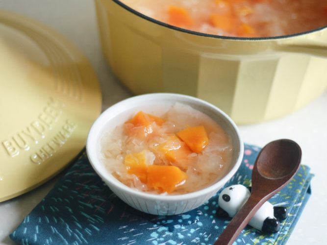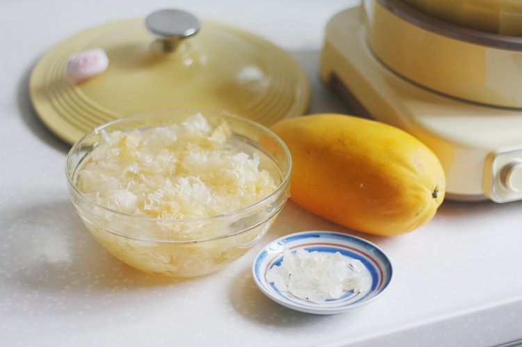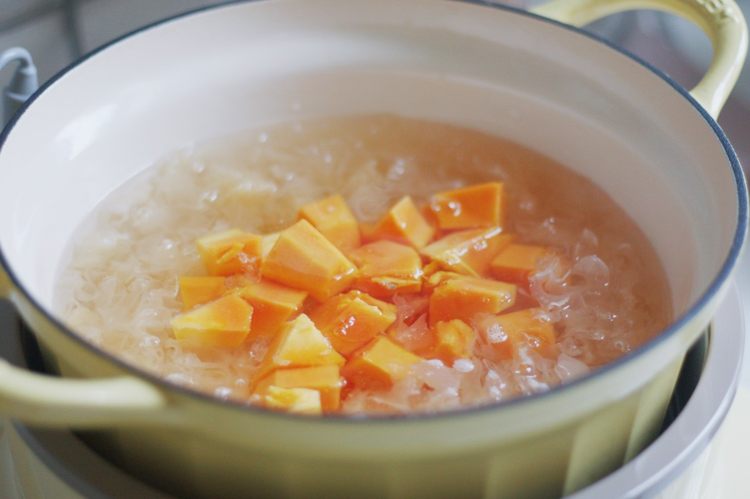 在锅里放入撕碎的银耳和清水,盖上锅盖,启动【海鲜粥】的【浓稠口感】,烹煮时间还剩20分钟时,再加入冰糖和木瓜后盖上盖子