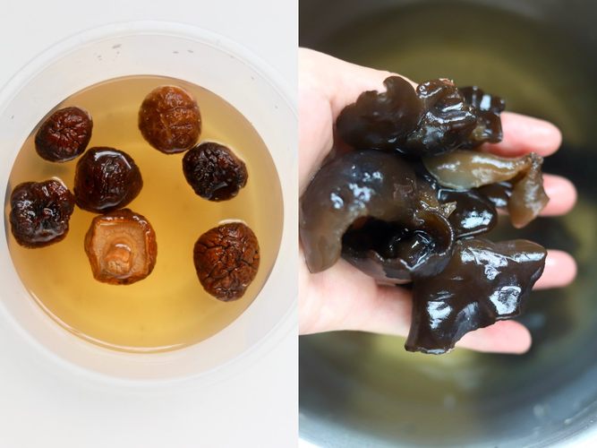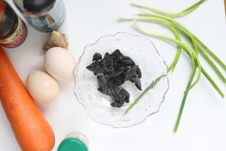 木耳和香菇分别用水泡发,切成小丁,胡萝卜去皮切小丁,葱切葱花,姜切末,大葱切碎