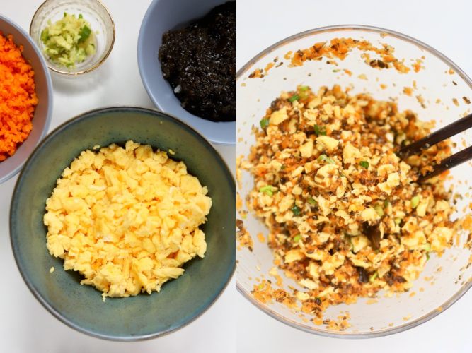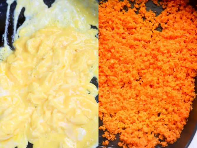 2个鸡蛋+1个蛋黄打散,锅中少许油把鸡蛋炒熟后盛出,底油把胡萝卜丁炒熟
