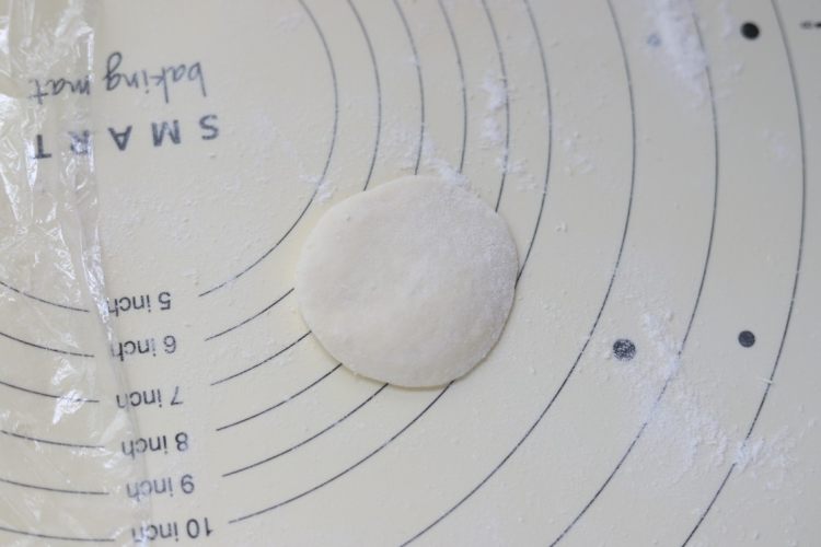 撒少许手粉,把面剂子擀开,不要擀太薄