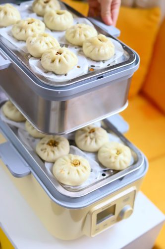 发酵完成后,设置速蒸8分钟,关火后先不要着急开盖,焖2分钟后再打开