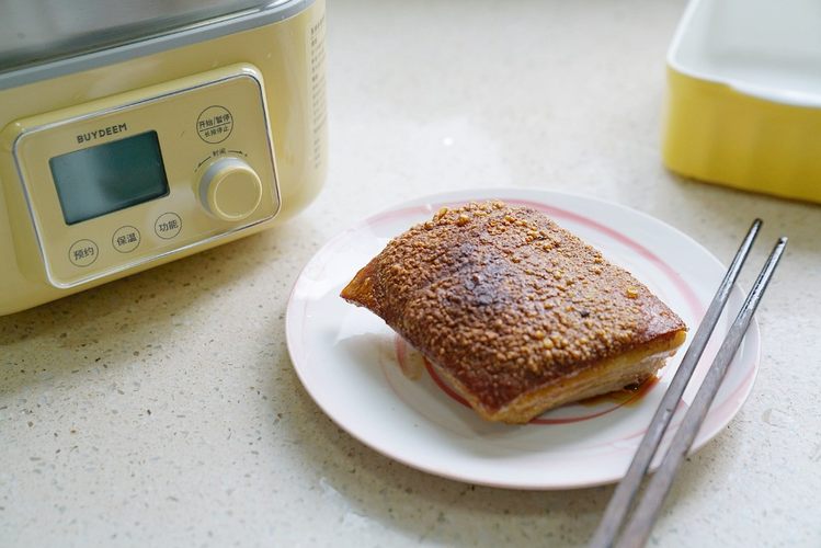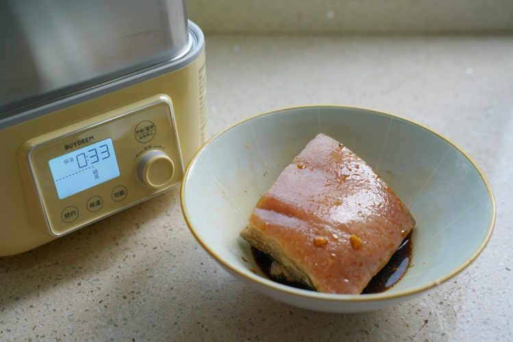 开吃前,将蒸好的梅菜扣肉如图这样子倒扣到平盘里面
