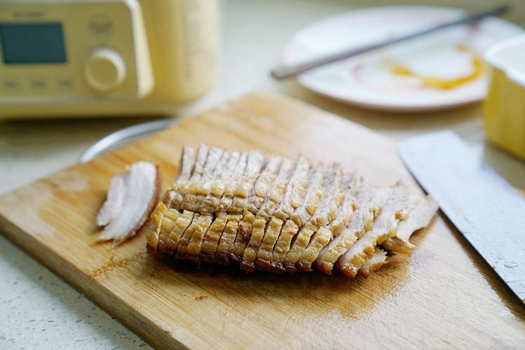 等炸好的五花肉冷 却之后,再切成厚薄相等的薄片