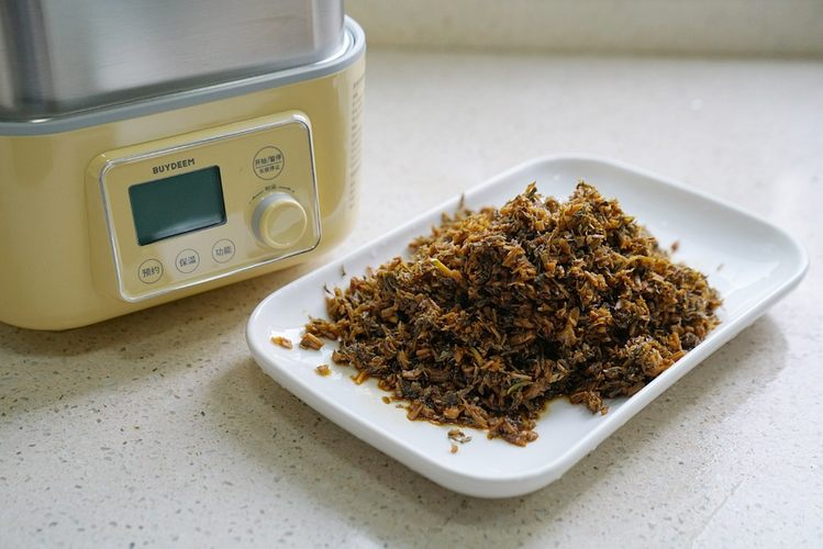 梅干菜泡洗一下控水备用,在这里要注意,记得要尝一下梅干菜的咸味,这样子后面才好调味。因为有些梅干菜是偏咸,有些又是原味