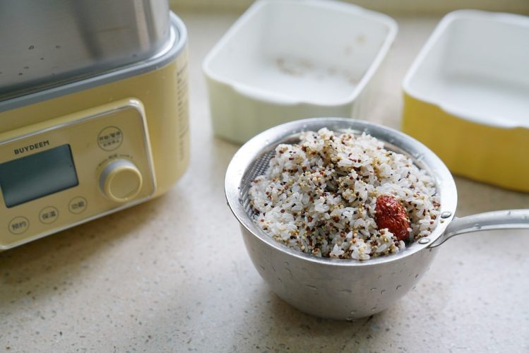 将藜麦及大米混合在一起,泡制10分钟,这样子蒸出来的米饭才干香饱满