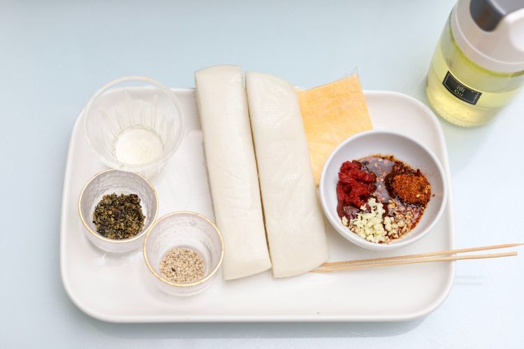 取出年糕,趁热做最后调味装饰:芝士海苔味的年糕刷薄薄一层蜂蜜水,撒拌饭海苔碎;再韩式口味的年糕刷一层薄薄的韩式酱汁,撒熟的白芝麻