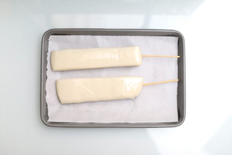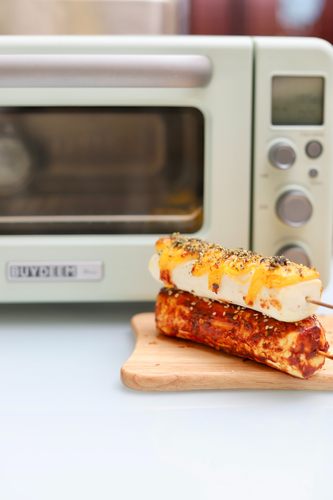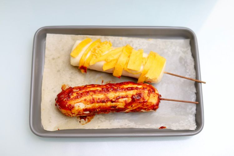 取出烤盘,在烤好的年糕上涂抹酱汁,一块年糕涂抹韩式风味酱汁,另一块刷蜂蜜水,把芝士片撕开平铺表面