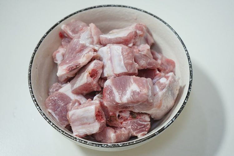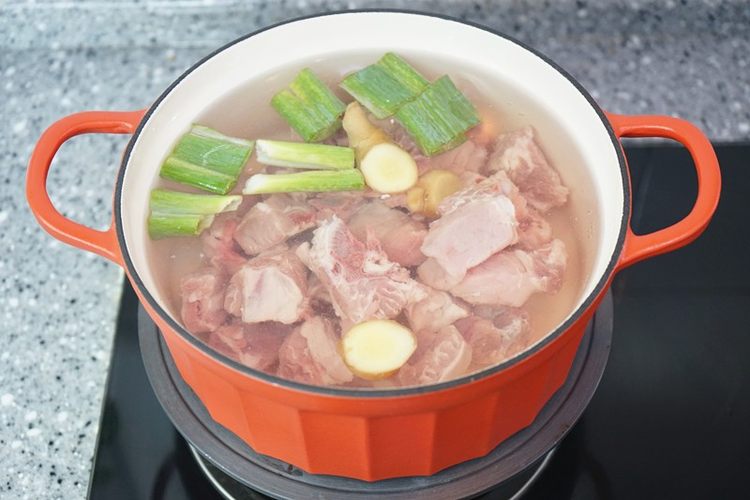 排骨冷水入锅,生姜片放进去,1勺料酒中火煮开,温水冲净浮沫待用