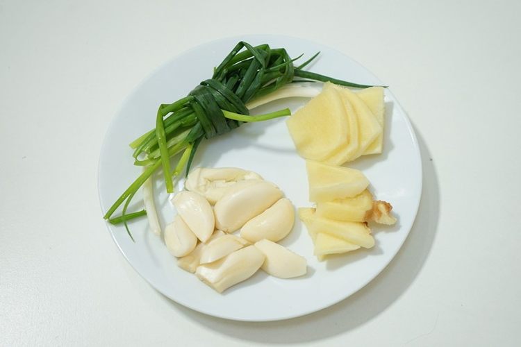 大蒜去掉外壳,生姜去皮切块,葱结洗净准备1个