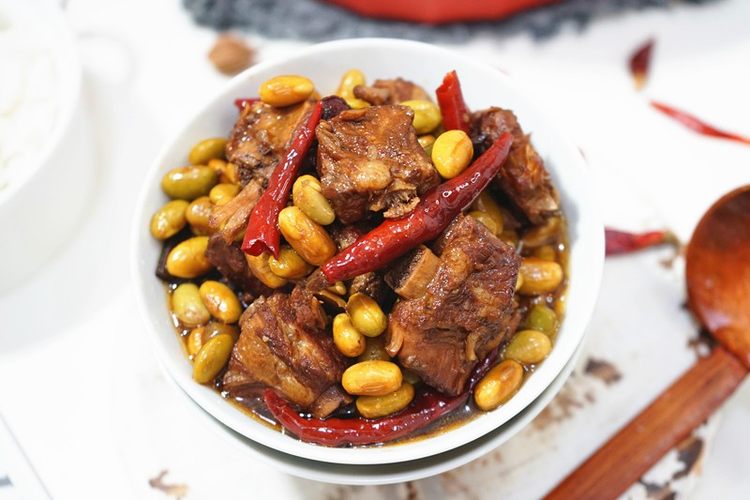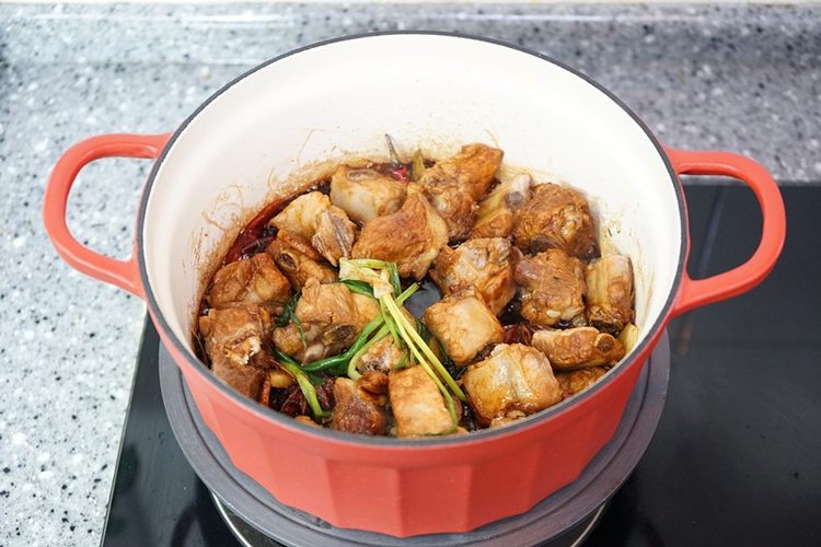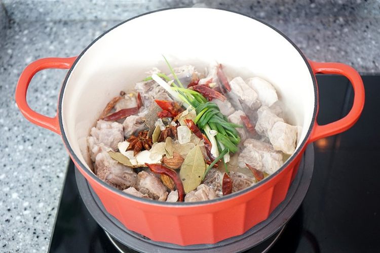 锅里放油小火爆香大蒜生姜片,排骨放进去中火炒两分钟,然后加入葱结,香料,冰糖继续炒三分钟
