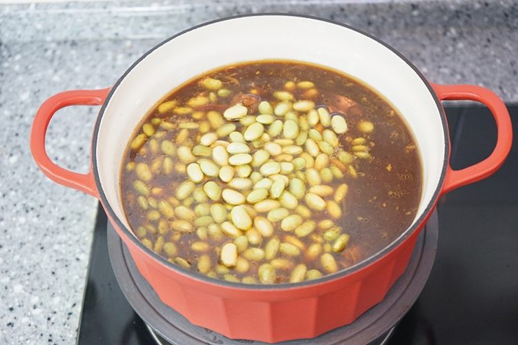 洗干净的毛豆米放进去搅拌均匀继续中小火煮20分钟