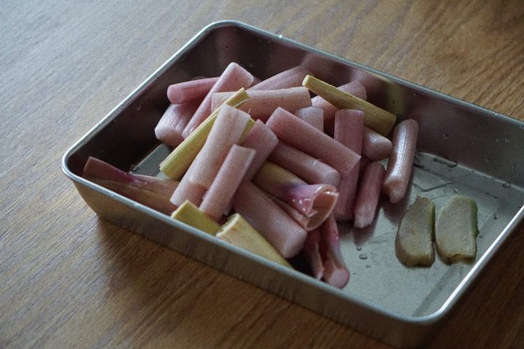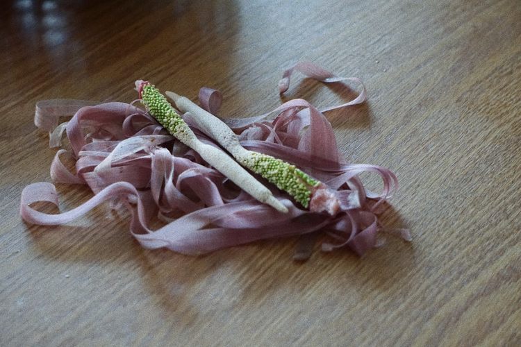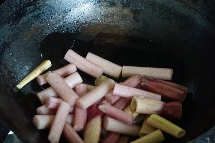 芋头花去除花蕊部分,手指轻轻提起花杆外皮,顺势往下边提边撕,将所有外皮去除