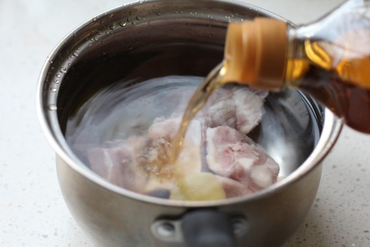 因为只做一人份, 5-6段就可以了(我买了100块的排骨,按照这个份量做可以吃一星期,哈哈),加两片姜,适量料酒和清水
