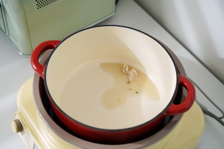 选择“煮米饭”-“煲仔饭”-“适中口感”,按下“开始”,然后锅底抹上一小块猪油(猪油更香,若没有可用其他油代替)