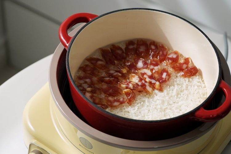在电磁炉显示剩余15分钟的时候揭盖,快速码上腊肠片,再次盖上锅盖等待剩余的时间结束