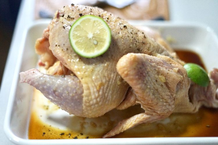 准备食材:三黄鸡一只,将15克盐,2勺蜂蜜,4勺生抽涂于鸡表面,腌制1小时