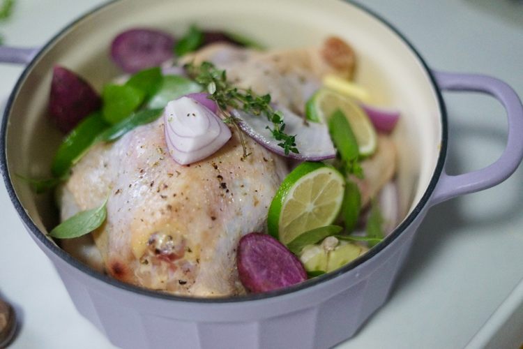 将腌制好的鸡和配菜放入北鼎珐琅锅