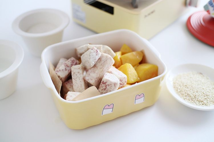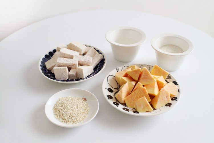 红薯芋头洗干净去皮,切成大一点的滚刀块备用,白芝麻提前炒熟