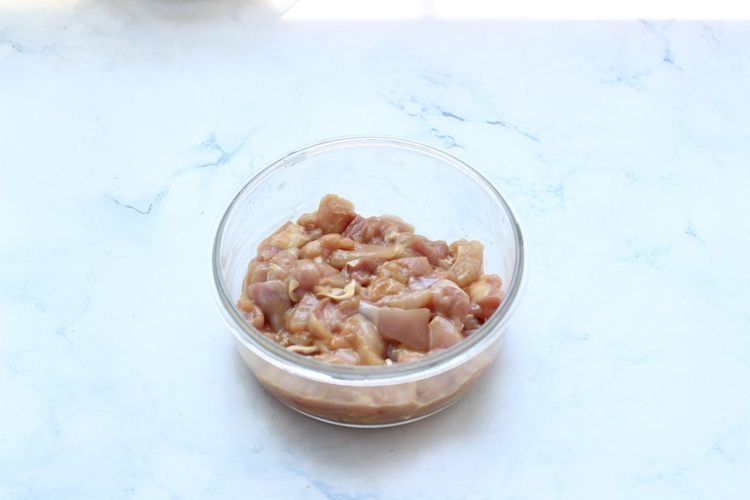 鸡大腿去掉鸡皮,鸡骨头后,切小块,用料酒,淀粉,一点点盐,生抽,抓均匀腌制20分钟左右