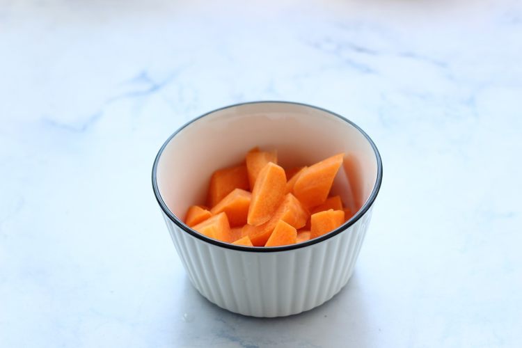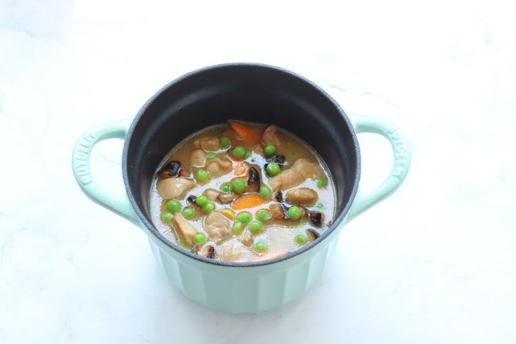 把炒好的食材全部倒入北鼎珐琅焖煮锅里,注入盖过食材大约1厘米的水,可以加点豌豆点缀下