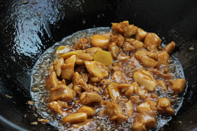 先炒鸡肉,炒锅加入适量油,爆一下姜片。倒入腌好的鸡肉,炒至变色后,加蚝油,加点糖提个味
