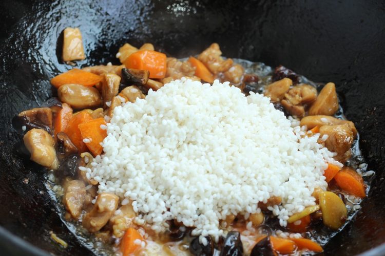 倒入淘好的米,翻炒,让大米均匀的裹上颜色