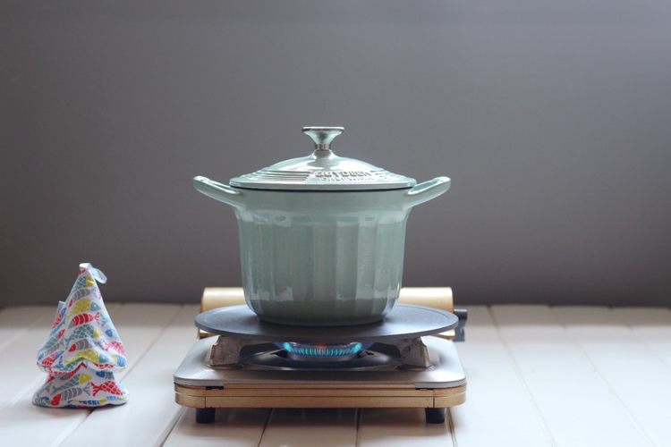 为了让锅受热更均匀,也避免锅底变色,我们在炉子上放上一块导热板
